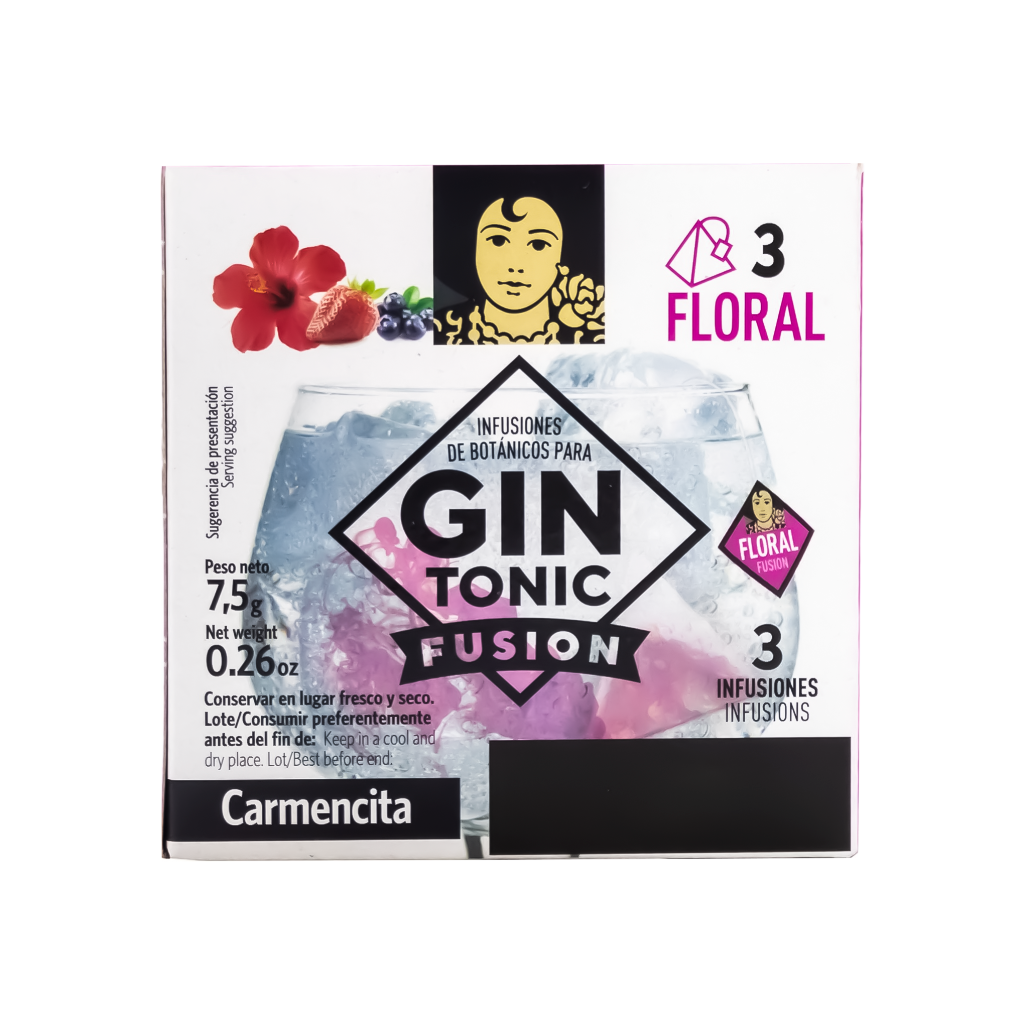 INGREDIENTES FLOR DE HIBISCO 83 %, ARÁNDANO DESHIDRATADO 14 %, FRESA DESHIDRATADA 2 % Y AROMA DE FRESA 1 %.MODO DE EMPLEOEN UNA COPA VIERTE 50 ML DE GINEBRA.INTRODUCE LA BOLSITA DURANTE 2 MIN.AÑADE HIELO Y REMUEVE BIEN. INCORPORA TÓNICA, (UNOS 200 ML).