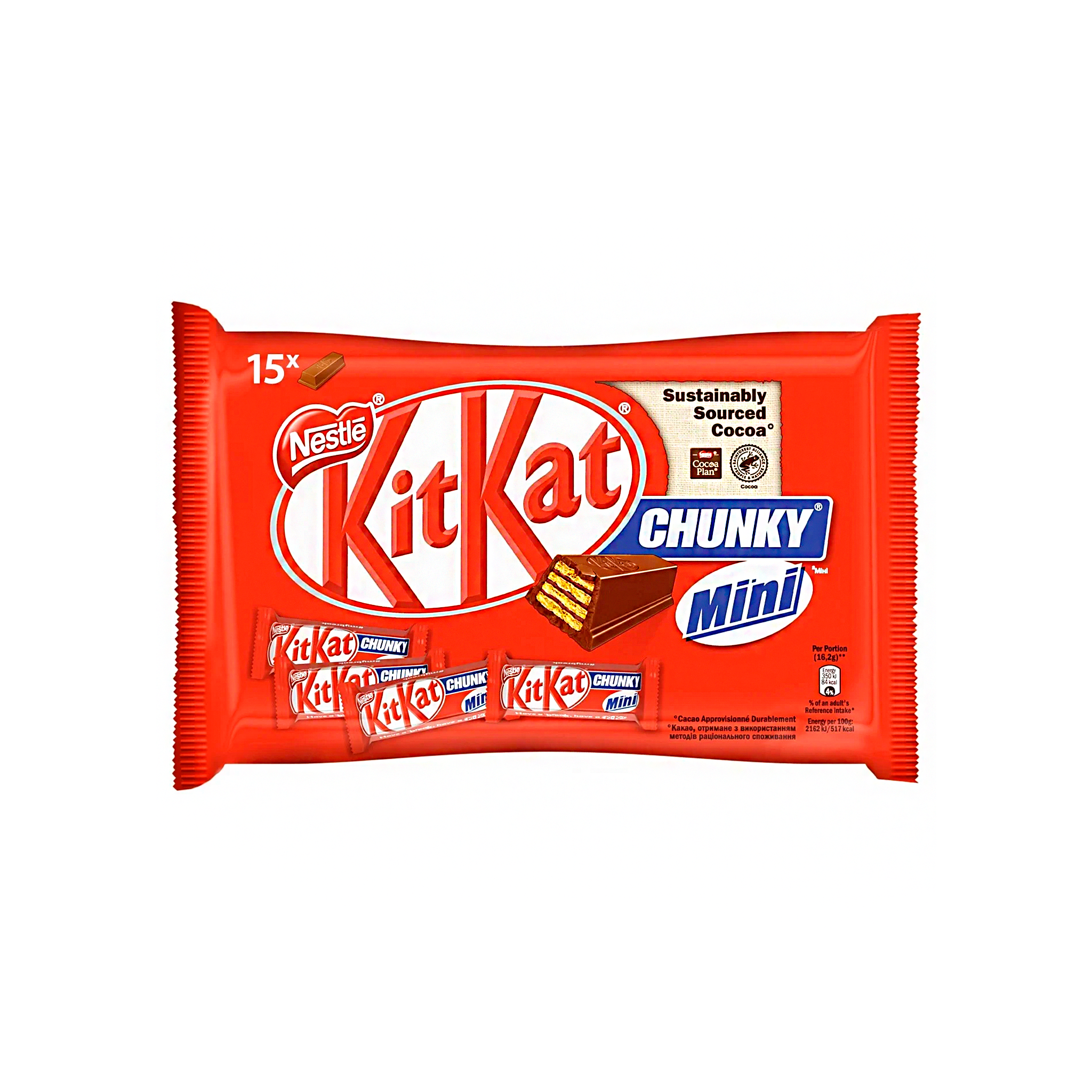 KITKAT MINI CHUNKY ES UN DELICIOSO CHOCOLATE DE 2 BARRITAS DE OBLEA CROCANTE, CUBIERTO DE CHOCOLATE CON LECHE. EL SNACK IDEAL PARA AQUELLOS QUE VALORAN SUS BREAKS.