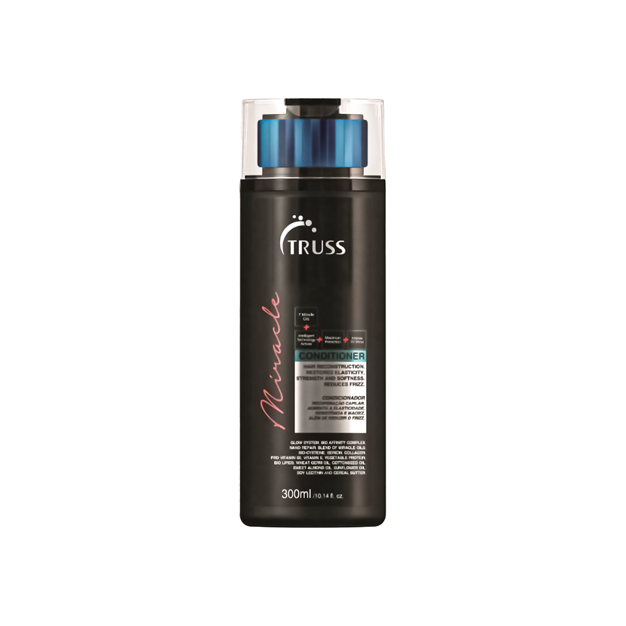 ACONDICIONADOR PARA TODO TIPO DE CABELLO. TRUSS MIRACLE RESTAURA LA FLEXIBILIDAD Y SUAVIDAD DEL CABELLO CON UN EFECTO ANTI-FRIZZ Y BRILLO 3D.  TRUSS MIRACLE CONDITIONER TAMBIÉN AYUDA A RECUPERAR LA ELASTICIDAD Y LA RESISTENCIA. ADEMÁS, LA FÓRMULA COMBATE EL ENCRESPAMIENTO Y MANTIENE EL CABELLO SEDOSO Y SUAVE DURANTE MUCHO TIEMPO. EL CABELLO QUEDA DESENREDADO, REPARADO Y CON UN BRILLO RADIANTE.